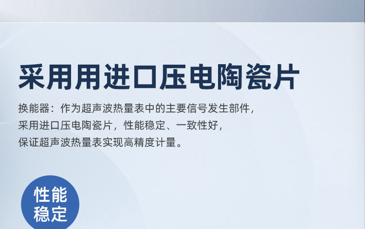 1、換能器:作為超聲波熱量表中的主要信號發生部件,采用進口壓電陶瓷片,性能穩定、一致性好,保證超聲波熱量表實現高精度計量。