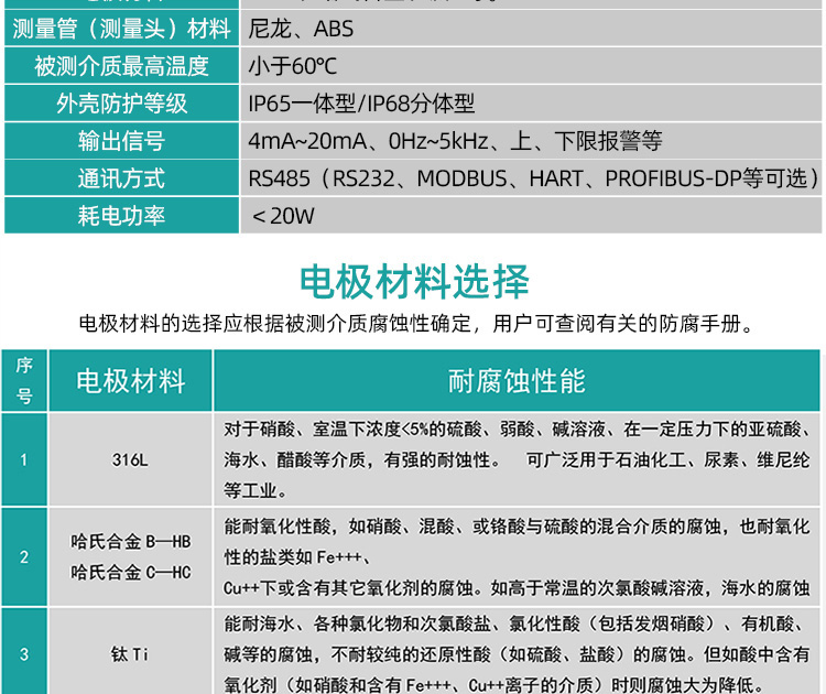 電極材料:316L不銹鋼、HC、HB、鈦、鉭、鉑/銥合金可選