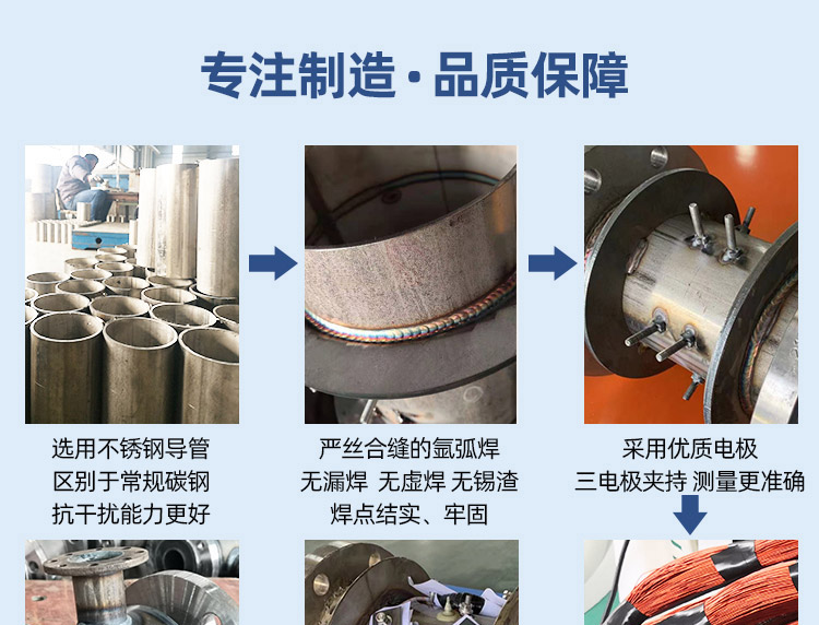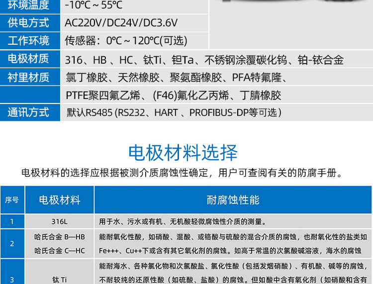 電極材質 316、HB、HC、鈦Ti、鉭Ta 不銹鋼涂覆碳化鎢、鉑-銥合金